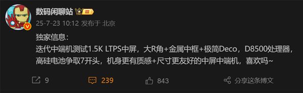 博主「数码闲聊站」爆料,Turbo 5 将首发 天玑 8500(可能 Ultra 版本),性能预计超越骁龙 8s Gen 4,也就是小米这次又将“中端战力”拉满 ;